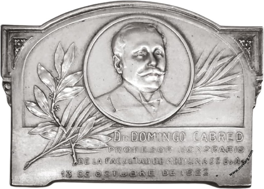 Anverso: DR. DOMINGO CABRED / PROFESOR HONORARIO / DE LA FACULTAD DE MEDICINA DE BS. AS. / 13 DE OCTUBRE DE 1922 Reverso: HOMENAJE DE LA FACULTAD DE MEDICINA / INSTITUTO DE PSIQUIATRIA / PROFESOR CABRED / BUENOS AIRES 13 DE OCTUBRE DE 1922. Exergo: [ PLATA ]. Firma: HORTA Referencia: | |