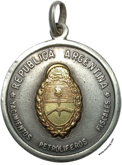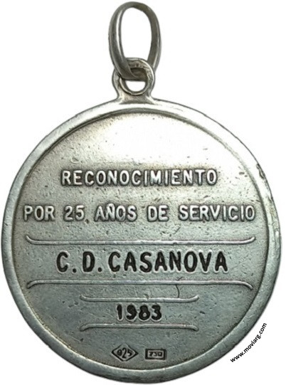 Anverso: REPUBLICA ARGENTINA / YACIMIENTOS PETROLIFEROS FISCALES Reverso: RECONOCIMIENTO / POR 25 AÑOS DE SERVICIO / [ C. D. CASANOVA ] / [ 1983 ]. Exergo: [ <925> ] / [ 750 ] Referencia: | |