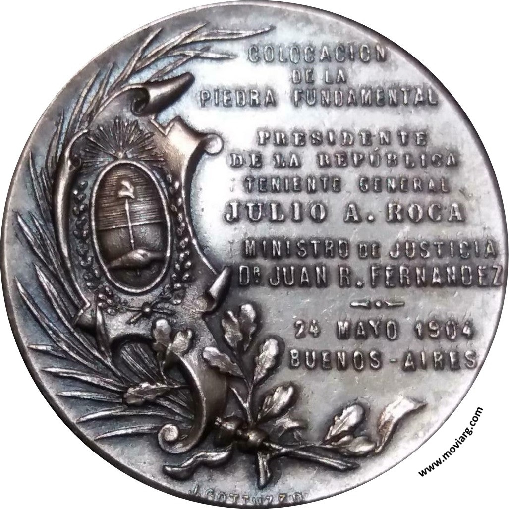 Anverso: PALACIO / DE / JUSTICIA. Campo: LEY Reverso: COLOCACION / DE LA / PIEDRA FUNDAMENTAL / PRESIDENTE / DE LA REPÚBLICA / TENIENTE GENERAL / JULIO A. ROCA / MINISTRO DE JUSTICIA / DR. JUAN R. FERNANDEZ / 24 MAYO 1904 / BUENOS - AIRES. Firma: J. GOTTUZZO Referencia: | |