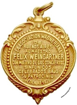 Meister & Sonntag Anverso:Reverso: [ LA ASOCIACIÓN WAGNERIANA ] / [ DE ] / [ BUENOS AIRES ] / [ AL MAESTRO ] / [ FELIX WEINGARTNER ] / [ CON MOTIVO DE LOS CONCIERTOS ] / [ SINFÓNICOS ] / [ CELEBRADOS BAJO ] / [ SU PATROCINIO ] / [ SETIEMBRE 1920 ] Referencia: | |