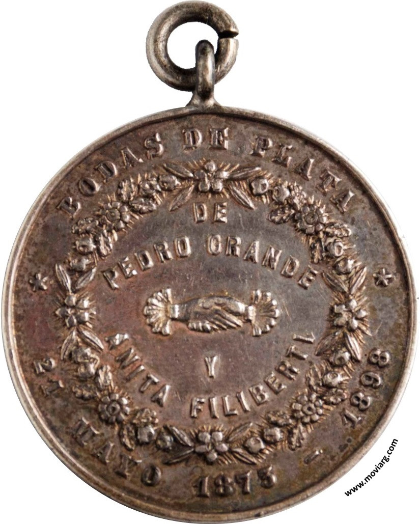 Anverso: BODAS DE PLATA / DE / PEDRO GRANDE / Y / ANITA FILIBERTI / 21 MAYO 1873 - 1898 Reverso: SUS HIJOS / TERESA / CATALINA / PEDRO / JULIO / MARIA / DALMIRO Y EUGENIO Referencia: | |