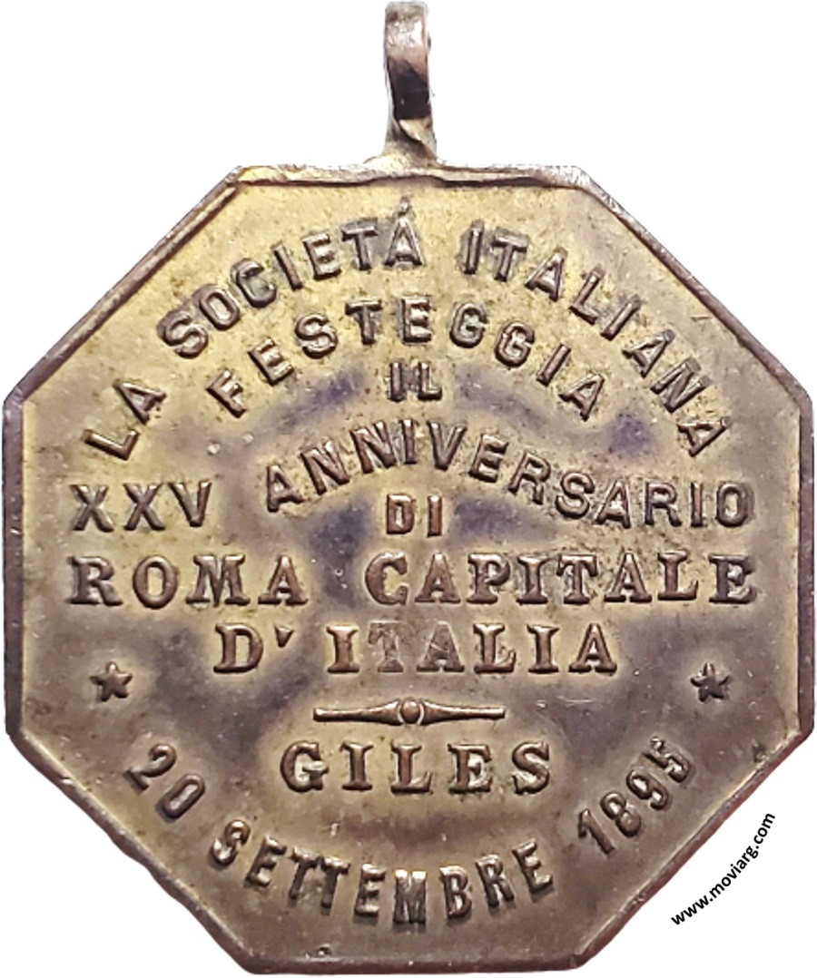 Anverso: Reverso: LA SOCIETÁ ITALIANA / FESTEGGIA / IL / XXV ANNIVERSARIO / DI / ROMA CAPITALE / D'ITALIA / GILES / 20 SETTEMBRE 1895 Referencia: | |