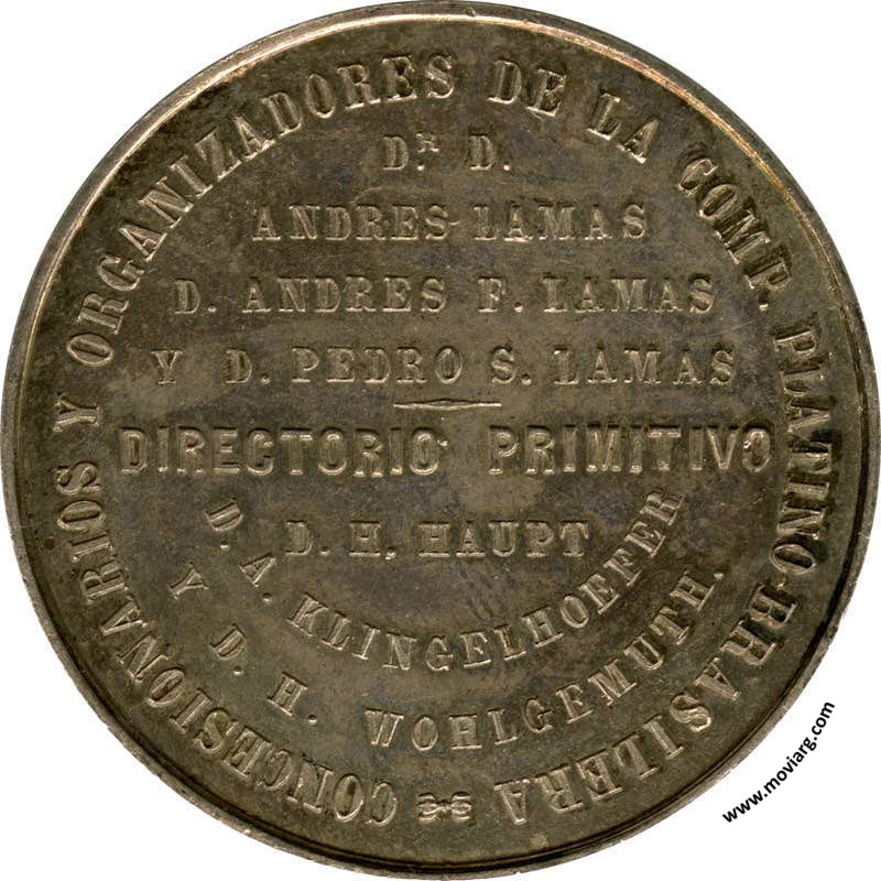 Anverso: TELEGRAFOS SUB-MARINO ENTRE EL RIO DE LA PLATA Y EL BRASIL Y TERRESTRE EN LA REP. O. DEL URUGUAY / 1874. Firma: A.M. Reverso: CONCESIONARIOS Y ORGANIZADORES DE LA COMP. PLATINO-BRASILERA / DR. D. / ANDRES LAMAS / D. ANDRES F. LAMAS / Y D. PEDRO S. LAMAS / DIRECTORIO PRIMITIVO / D. H. HAUPT / D. A. KLINGELHOEFER / Y D. H. WOHLGEMUTH. Referencia: BURZIO-654 | |