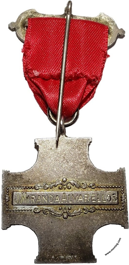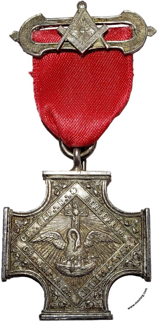 Anverso: GR .·. CAP .·. R .·. / CONCORDIA / GR .·. OR .·. ARG .·. / RITO E .·. A .·. Y A .·. Reverso: [ J. MIRANDA ALVARELLOS ] . Firma: R. GRANDE Canto: Liso. Nota Moviarg: Esta medalla no figura en los catálogos de Alejandro Rosa (años 1892 y 1898) por lo que se presume la misma ha sido acuñada con posterioridad. Es por ello que se la asigna, con cierta incertidumbre, al año (1900). Referencia: | |