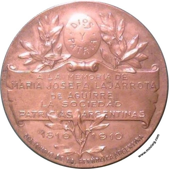 Anverso: 1757 / 1822 Reverso: DIOS / Y / PATRIA / Á LA MEMORIA DE / MARIA JOSEFA LAJARROTA / DE AGUIRRE / LA SOCIEDAD / PATRICIAS ARGENTINAS / 1810 1910 / CENTENARIO DE LA REPÚBLICA ARGENTINA Referencia: | |
