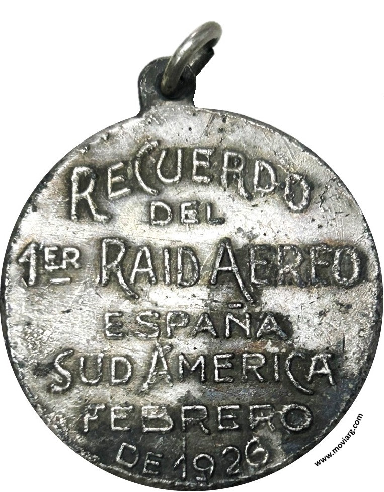 Anverso: COMANDANTE / FRANCO Reverso: RECUERDO / DEL / 1ER. RAID AEREO / ESPAÑA / SUB AMERICA / FEBRERO / DE 1926 Canto: Humberto Burzio: "Buenos Aires en la medalla" 1981 p300. Referencia: BURZIO-891 | |