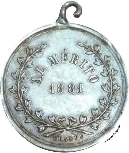 | Año: 1881 Premio al Mérito y Aplicación Metal: Plata - Peso: 14gr - Módulo: 30mm - Rotación: 12hrs Grabador: Rosario Grande | |