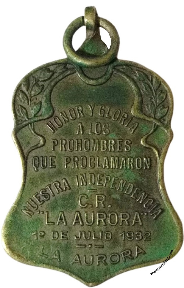Anverso: Firma: C. Y AF. ROSSI Reverso: HONOR Y GLORIA / A LOS / PROHOMBRES / QUE PROCLAMARON / NUESTRA INDEPENDENCIA / C.R. / " LA AURORA " / 1° DE JULIO 1932 / LA AURORA Referencia: | |