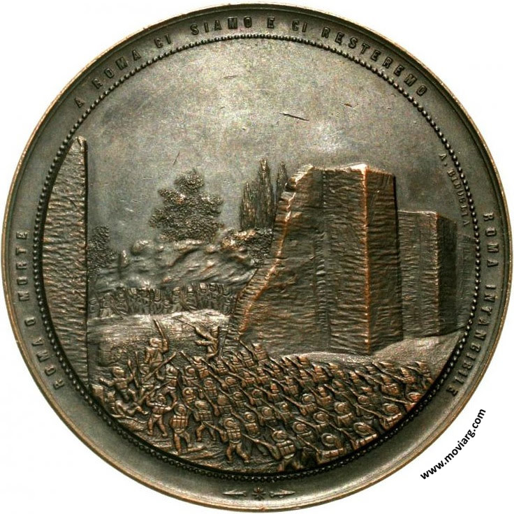 Anverso: Exergo: ROMA O MORTE / A ROMA CI SIAMO E CI RESTEREMO / ROMA INTANGIBILE. Firma: A. BIDOGLIA Reverso: XXV° ANNIVERSARIO DELLA PRESA DI ROMA / XX SETTEMBRE MDCCXCV (sic) - BUENOS AIRES. Campo: S.P.Q.R. Referencia: | |