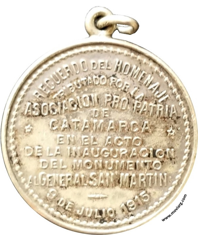Anverso: Reverso: RECUERDO DEL HOMENAJE / TRIBUTADO POR LA / ASOCIACION PRO PATRIA / DE / CATAMARCA / EN EL ACTO / DE LA INAUGURACION / DEL MONUMENTO / AL GENERAL SAN MARTIN / 9 DE JULIO 1915 Referencia: | |