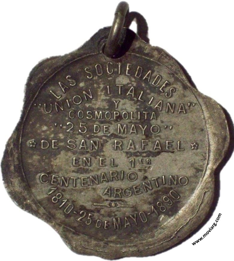 Anverso: Reverso: LAS SOCIEDADES / " UNION ITALIANA " / Y / COSMOPOLITA / " 25 DE MAYO " / DE SAN RAFAEL / EN EL 1ER. / CENTENARIO / ARGENTINO / 1810 - 25 DE MAYO - 1890 (sic) Referencia: | |