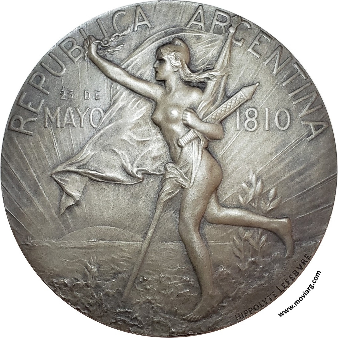 Anverso: REPUBLICA ARGENTINA / 25 DE / MAYO / 1810. Firma: HIPPOLYTE LEFEBVRE Reverso: PER. (Primer) CENTENARIO DE LA / INDEPENDENCIA / 1910. Firma: HIPPOLYTE LEFEBVRE Canto: Liso. ARGENT Referencia: | |
