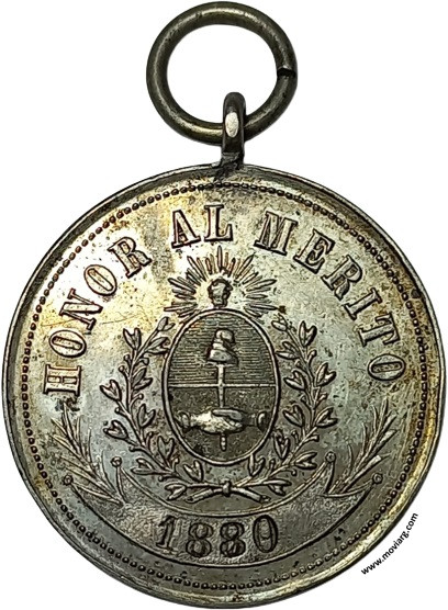 | Año: (1880) Premio al Mérito y Aplicación Metal: Plata - Peso: 9.35gr - Módulo: 27.38mm - Espesor: 1.85mm - Rotación: 12hrs Grabador: (Rosario Grande) | |