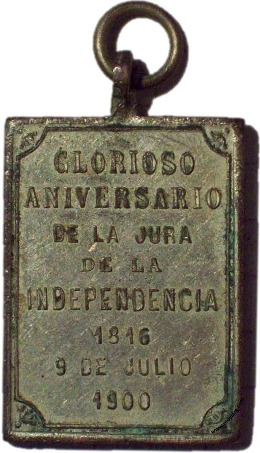 Anverso: REPÚBLICA / ARGENTINA. Firma: BELLAGAMBA Y ROSSI Reverso: GLORIOSO / ANIVERSARIO / DE LA JURA / DE LA / INDEPENDENCIA / 1816 / 9 DE JULIO / 1900 Referencia: | |