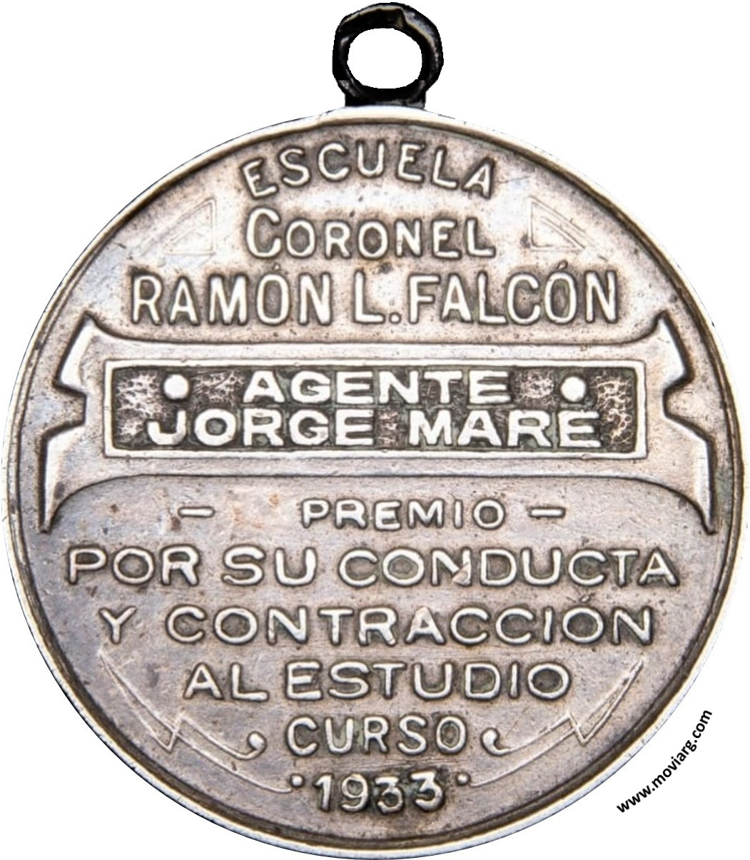Anverso: REPÚBLICA ARGENTINA / POLICIA DE LA CAPITAL FEDERAL. Firma: CONSTANTE ROSSI Reverso: ESCUELA / CORONEL / RAMÓN L. FALCÓN / [ AGENTE ] / [ JORGE MARE ] / PREMIO / POR SU CONDUCTA / Y CONTRACCIÓN / AL ESTUDIO / CURSO / 1933 Referencia: | |