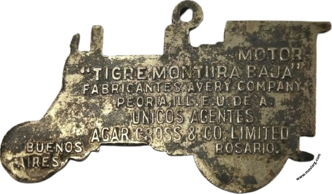 Anverso: Campo: AVERY Reverso: MOTOR / " TIGRE MONTURA BAJA " / FABRICANTES AVERY COMPANY / PEORIA, ILL. E. U. DE A. / UNICOS AGENTES / AGAR, CROSS & CO. LIMITED / BUENOS / AIRES / ROSARIO. Referencia: | |