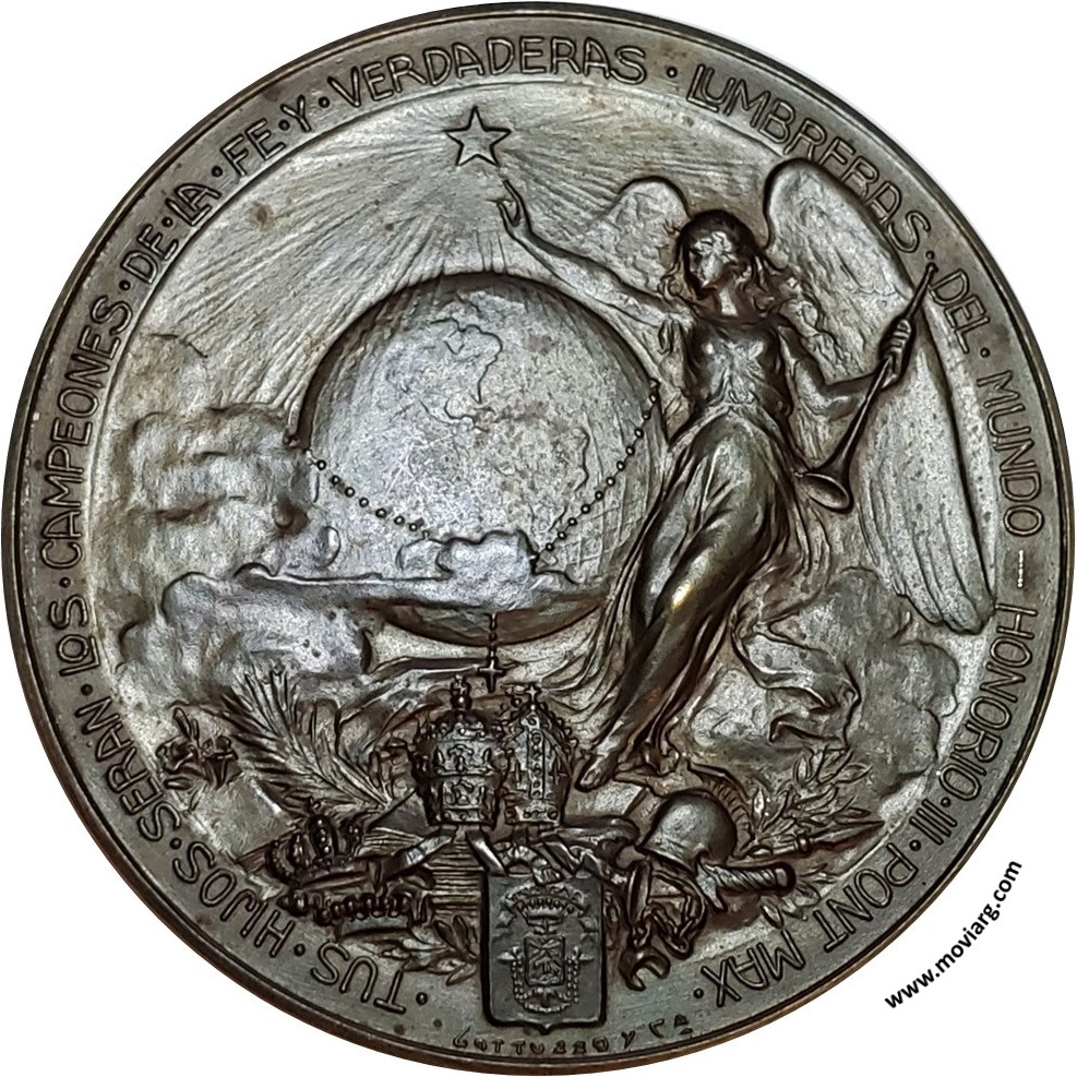 Anverso: MESSIS · QUIDEM · MULTA / SEPTIMUS · CENTENARIUS · CONFIRMATIONIS · ORDINIS · PRAEDICATORUM / 1216 - 1916 Reverso: · TUS · HIJOS · SERAN · LOS · CAMPEONES · DE · LA · FE · Y · VERDADERAS · LUMBRERAS · DEL · MUNDO - HONORIO · III · PONT · MAX ·. Firma: GOTTUZZO Y CA. Referencia: | |