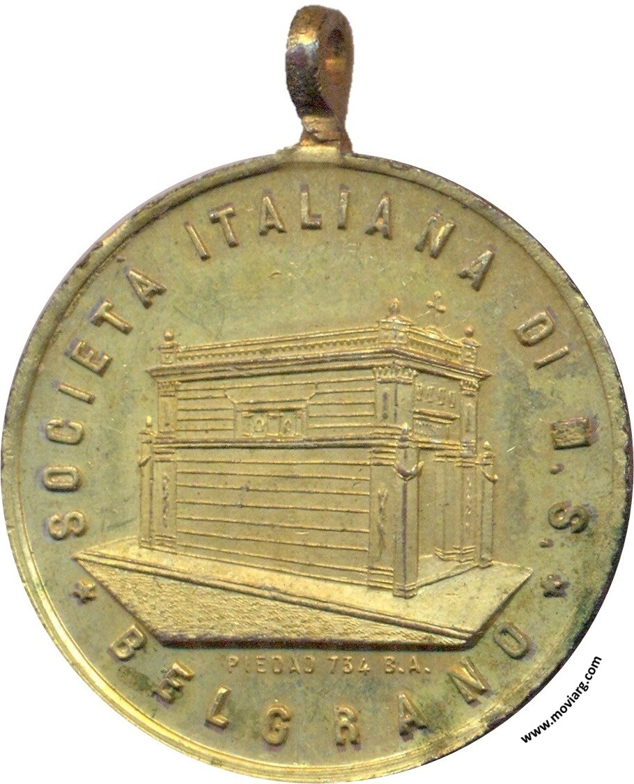 Anverso: SOCIETÁ ITALIANA DI M.S. / BELGRANO. Firma: PIEDAD 734 B.A. Reverso: RICORDO / COLLOCAZIONE / DELLA / PIETRA FONDAMENTALE / 13 / OTTOBRE / 1895 Referencia: | |