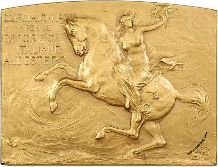 | Año: 1910 Exposiciones Metal: Dorado - Peso: 147.9gr - Módulo: 60.6x79.1mm - Espesor: 3.4mm - Rotación: 12hrs Grabador: Stefano Carlo Johnson (Milano) | |