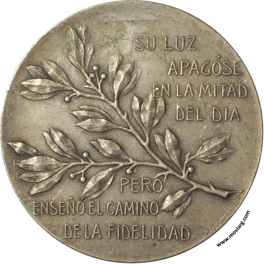 Anverso: 14 - NOVIEMBRE - 1909 / JUAN ALBERTO / LARTIGAU Reverso: SU LUZ / APAGÓSE / EN LA MITAD / DEL DIA / PERO / ENSEÑO EL CAMINO / DE LA FIDELIDAD. Firma: J. GOTTUZZO Y CA. Canto: Humberto Burzio: "Buenos Aires en la medalla" 1981 p321. Referencia: BURZIO-942 | |