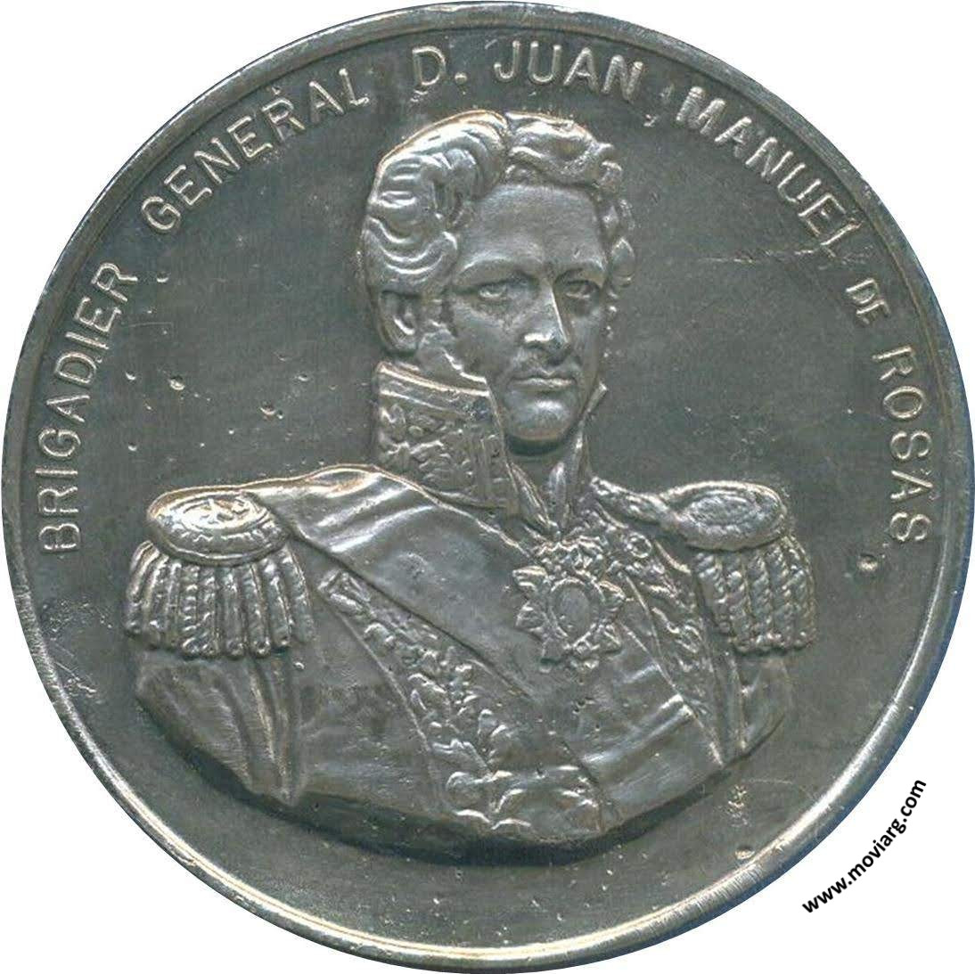 Anverso: BRIGADIER GENERAL D. JUAN MANUEL DE ROSAS Reverso: HOMENAJE / AL LEGATARIO / DEL GLORIOSO SABLE CORVO / DEL / GENERAL D. JOSE DE SAN MARTIN / SUS COMPATRIOTAS / 126° ANIVERSARIO / DEL TESTAMENTO / DEL LIBERTADOR / 1844 - 23 ENERO - 1970 Referencia: | |