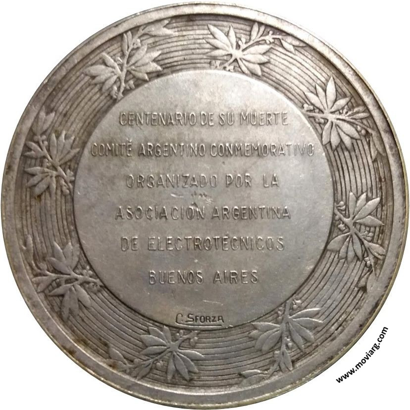Anverso: ALEJANDRO VOLTA / 1827 - 1927. Firma: C. SFORZA Reverso: CENTENARIO DE SU MUERTE / COMITÉ ARGENTINO CONMEMORATIVO / ORGANIZADO POR LA / ASOCIACIÓN ARGENTINA / DE ELECTROTÉCNICOS / BUENOS AIRES. Firma: C. SFORZA Referencia: | |