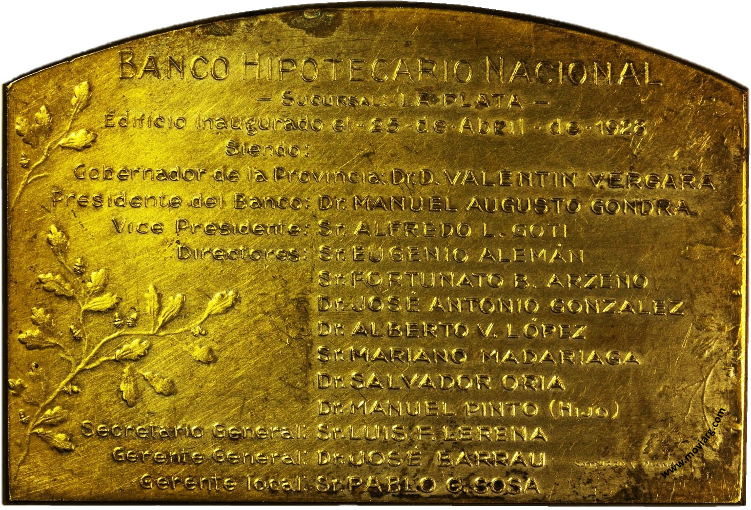 Colección @parryyanumismatico Anverso:Reverso: BANCO HIPOTECARIO NACIONAL / SUCURSAL: LA PLATA / EDIFICIO INAUGURADO EL 25 DE ABRIL DE 1928 / SIENDO: / GOBERNADOR DE LA PROVINCIA: DR. D. VALENTIN VERGARA / PRESIDENTE DEL BANCO: DR. MANUEL AUGUSTO GONDRA / VICE PRESIDENTE: SR. ALFREDO L. GOTI / DIRECTORES: SR. EUGENIO ALEMÁN / SR. FORTUNATO B. ARZENO / DR. JOSÉ ANTONIO GONZALEZ / DR. ALBERTO V. LÓPEZ / SR. MARIANO MADARIAGA / DR. SALVADOR ORIA / DR. MANUEL PINTO (HIJO) / SECRETARIO GENERAL: SR. LUIS F. LERENA / GERENTE GENERAL: DR. JOSÉ BARRAU / GERENTE LOCAL: SR. PABLO G. SOSA. Firma: GOTTUZZO Y PIANA Referencia: | |