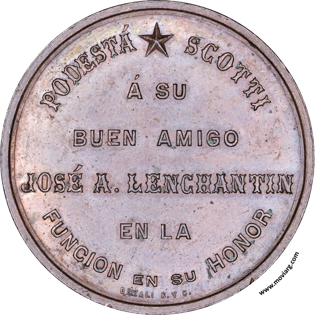 Anverso: BUENOS - AIRES MAYO 2 DE 1896. Campo: PATRIA / Y / HONOR Reverso: PODESTÁ / SCOTTI / Á SU / BUEN AMIGO / JOSÉ A. LENCHANTIN / EN LA / FUNCION EN SU HONOR. Firma: ORZALI B. Y C. Referencia: | |