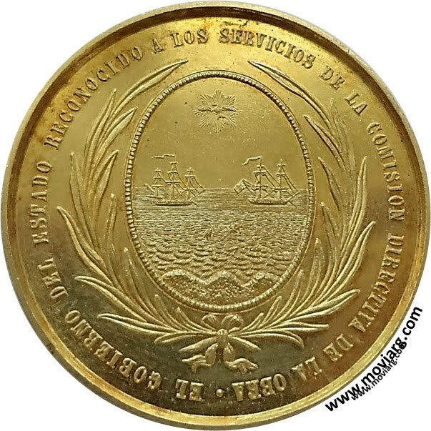 | Año: 1857 Obras y Servicios Públicos Metal: Oro - Peso: 117.7gr - Módulo: 47.51mm - Espesor: 4.77mm - Rotación: 12hrs Grabador: Carlos Guillaume | |