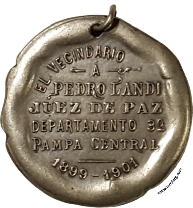 Anverso: HOMENAJE A LA RECTITUD. Firma: BELLAGAMBA Y ROSSI Reverso: EL VECINDARIO / Á / PEDRO LANDI / JUEZ DE LA PAZ / DEPARTAMENTO 3° / PAMPA CENTRAL / 1899 - 1901 Referencia: | |