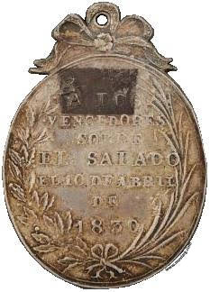 Anverso: A LOS / VENCEDORES / SOBRE / EL SALADO / EL 10 DE ABRIL / DE / 1830 Reverso: CORONEL D. ANGEL PACHECO / COMANDANTE EN GEFE (sic) DEL DEPARTAMENTO DEL NORTE Referencia: | |