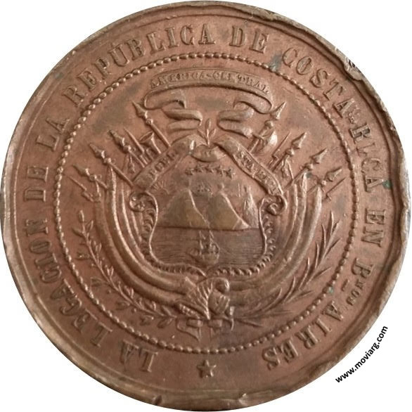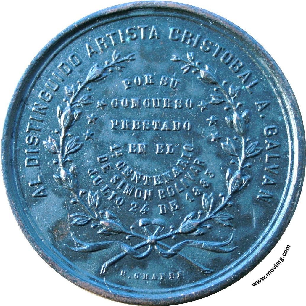 Anverso: LA LEGACIÓN DE LA REPÚBLICA DE COSTA-RICA EN BNOS. AIRES. Campo: REPUBLICA / COSTA RICA / AMERICA-CENTRAL Reverso: AL DISTINGUIDO ARTISTA CRISTOBAL A. GALVAN / POR SU / CONCURSO / PRESTADO / EN EL / 1R. CENTENARIO / DE SIMON BOLIVAR / JULIO 24 DE 1883. Firma: R. GRANDE Referencia: | |