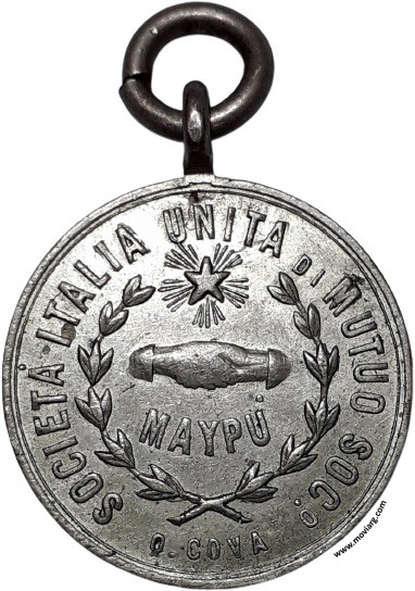 Anverso: SOCIETÁ ITALIA UNITA DI MUTUO SOCO. / MAYPÚ. Firma: Q. COVA Reverso: INAUGURAZIONE DEL EDIFICIO SOCIALE / 20 / SETTEMBRE / 1894 Referencia: | |