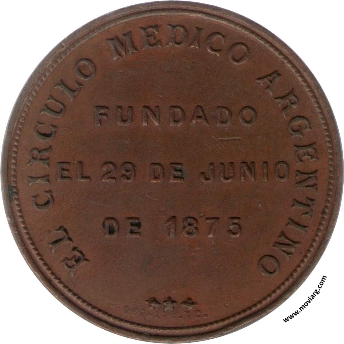 Anverso: INAUGURA SU EDIFICIO PROPIO / EL 1° DE ABRIL DE 1895 / BUENOS AIRES. Campo: C. M. ARGENTINO Reverso: EL CIRCULO MEDICO ARGENTINO / FUNDADO / EL 29 DE JUNIO / DE 1875. Firma: ORZALI B. Y C. Referencia: | |