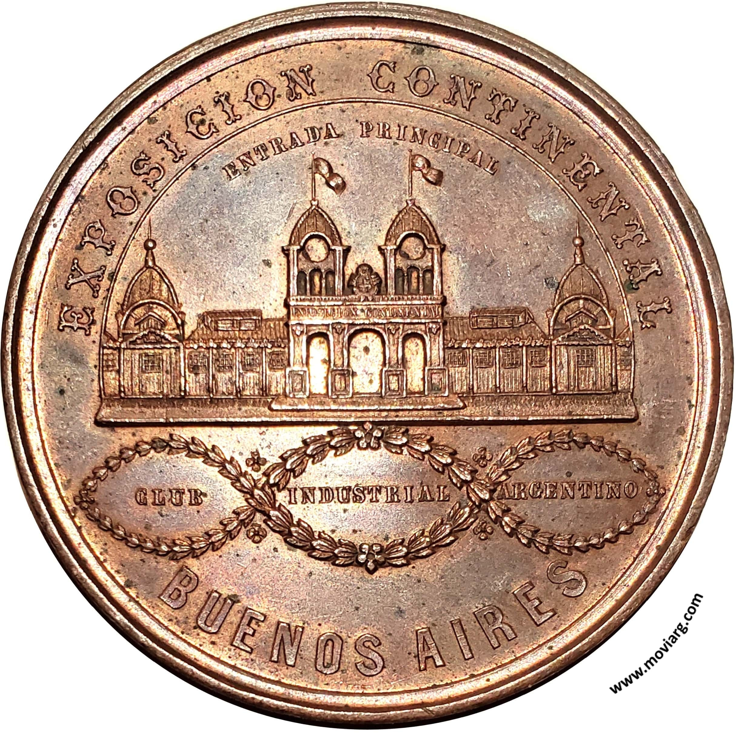 Anverso: EXPOSICION CONTINENTAL / BUENOS AIRES / ENTRADA PRINCIPAL / CLUB / INDUSTRIAL / ARGENTINO Reverso: INAUGURADA / EL XV DE MARZO / MDCCCLXXXII. Exergo: R. GRANDE B. AIRES Canto: Humberto Burzio: "Buenos Aires en la medalla" 1981 p442. Referencia: BURZIO-1277 ROSA-374 FERRARI-79 (RG) | |