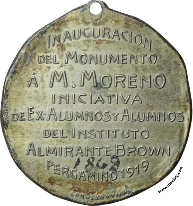 Anverso: MARIANO MORENO / 1778 - 1811 Reverso: INAUGURACIÓN / DEL MONUMENTO / Á M. MORENO / INICIATIVA / DE EX - ALUMNOS Y ALUMNOS / DEL INSTITUTO / ALMIRANTE BROWN / PERGAMINO 1919. Firma: GOTTUZZO Y PIANA Referencia: | |