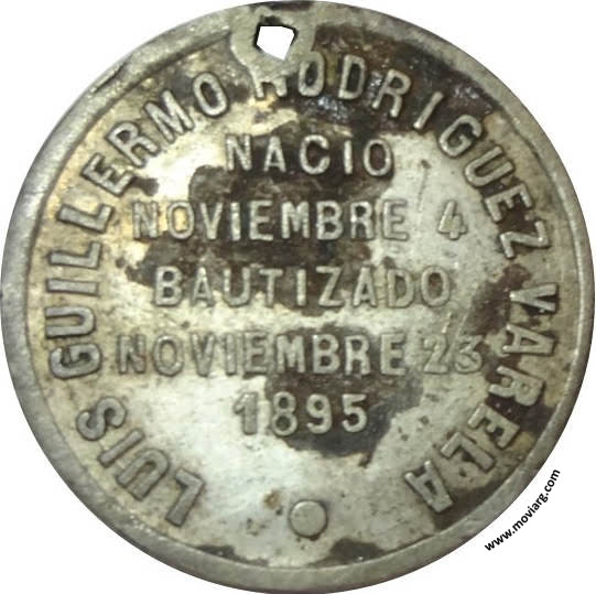 Anverso: RECUERDO DE BAUTISMO. Firma: ORZALI B. Y C. Reverso: LUIS GUILLERMO RODRIGUEZ VARELA / NACIO / NOVIEMBRE 4 / BAUTIZADO / NOVIEMBRE 23 / 1895 Canto: Liso Referencia: | |