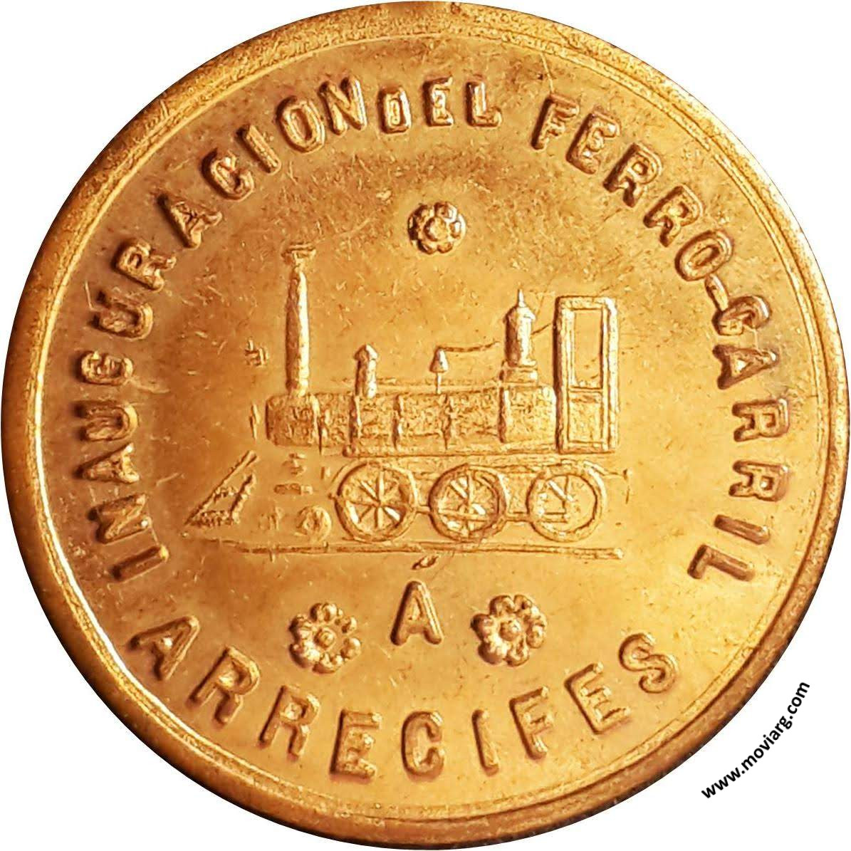 Anverso: INAUGURACION DEL FERRO-CARRIL / Á / ARRECIFES Reverso: BAJO LA ADMINISTRACION / DEL DOR. / DARDO ROCHA / 25 / DE / MAYO / DE / 1882 Referencia: | |