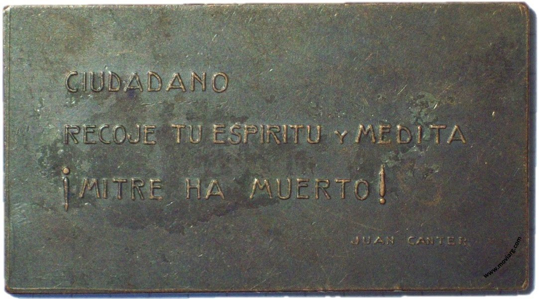 Anverso: 26 DE JUNIO DE 1821 / 19 DE ENERO DE 1906 Reverso: CIUDADANO / RECOJE TU ESPIRITU Y MEDITA / ¡ MITRE HA MUERTO !. Firma: JUAN CANTER Referencia: | |