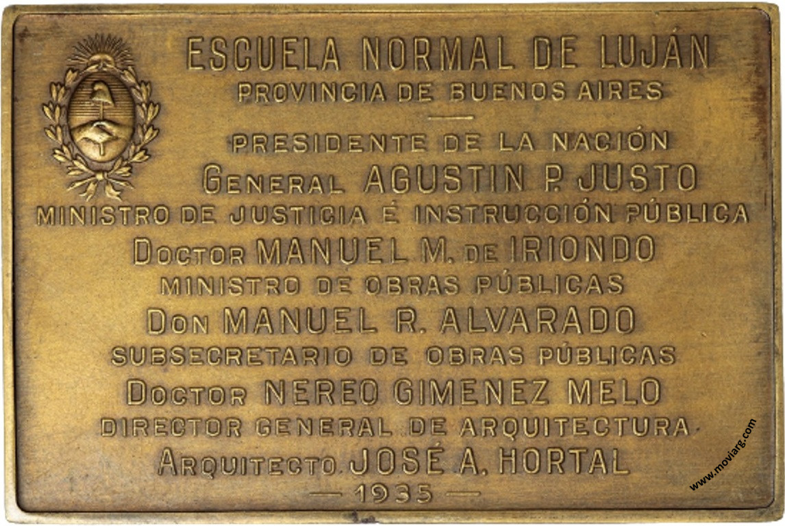 Anverso: Firma: CONSTANTE ROSSI Reverso: ESCUELA NORMAL DE LUJÁN / PROVINCIA DE BUENOS AIRES / PRESIDENTE DE LA NACIÓN / GENERAL AGUSTIN P. JUSTO / MINISTRO DE JUSTICIA É INSTRUCCIÓN PÚBLICA / DOCTOR MANUEL M. DE IRIONDO / MINISTRO DE OBRAS PÚBLICAS / DON MANUEL R. ALVARADO / SUBSECRETARIO DE OBRAS PÚBLICAS / DOCTOR NEREO GIMENEZ MELO / DIRECTOR GENERAL DE ARQUITECTURA / ARQUITECTO JOSÉ A. HORTAL / 1935 Referencia: | |