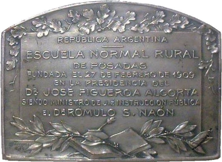 Anverso: Reverso: REPÚBLICA ARGENTINA / ESCUELA NORMAL RURAL / DE POSADAS / FUNDADA EL 27 DE FEBRERO DE 1909 / EN LA PRESIDENCIA DEL / DR. JOSÉ FIGUEROA ALCORTA / SIENDO MINISTRO DE J. É INSTRUCCION PÚBLICA / EL DR. RÓMULO S. NAÓN. Firma: GOTTUZZO Y CA. Referencia: | |