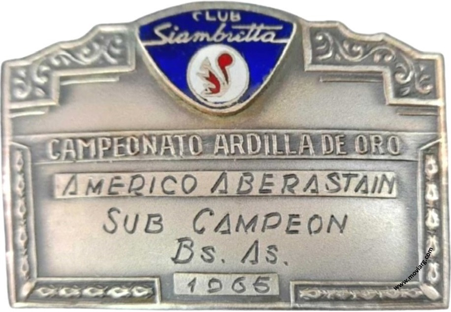 Anverso: CLUB / SIAMBRETTA / CAMPEONATO ARDILLA DE ORO / [ AMERICO ABERASTAIN ] / [ SUB CAMPEON ] / [ BS. AS. ] / [ 1965 ] Reverso: Referencia: | |