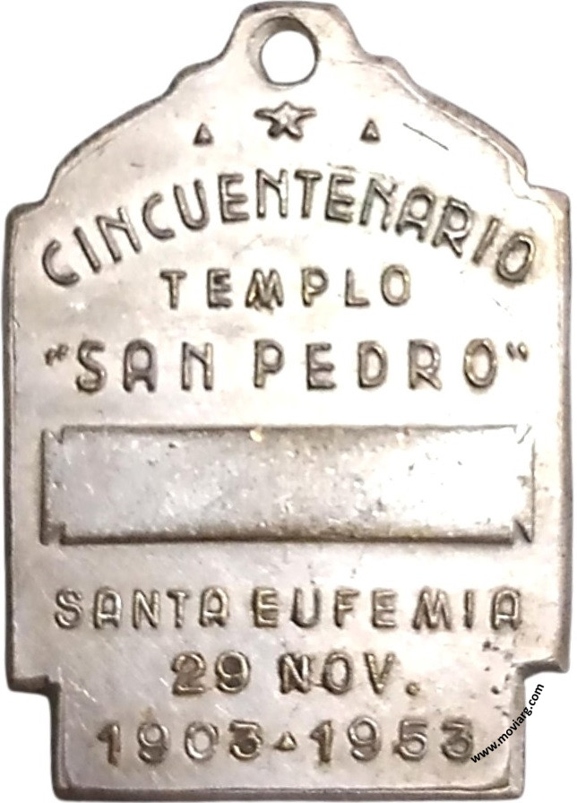 Anverso: Firma: O. GALLO / ARGENTINA Reverso: CINCUENTENARIO / TEMPLO / " SAN PEDRO " / SANTA EUFEMIA / 29 NOV. / 1903 - 1953 Referencia: | |