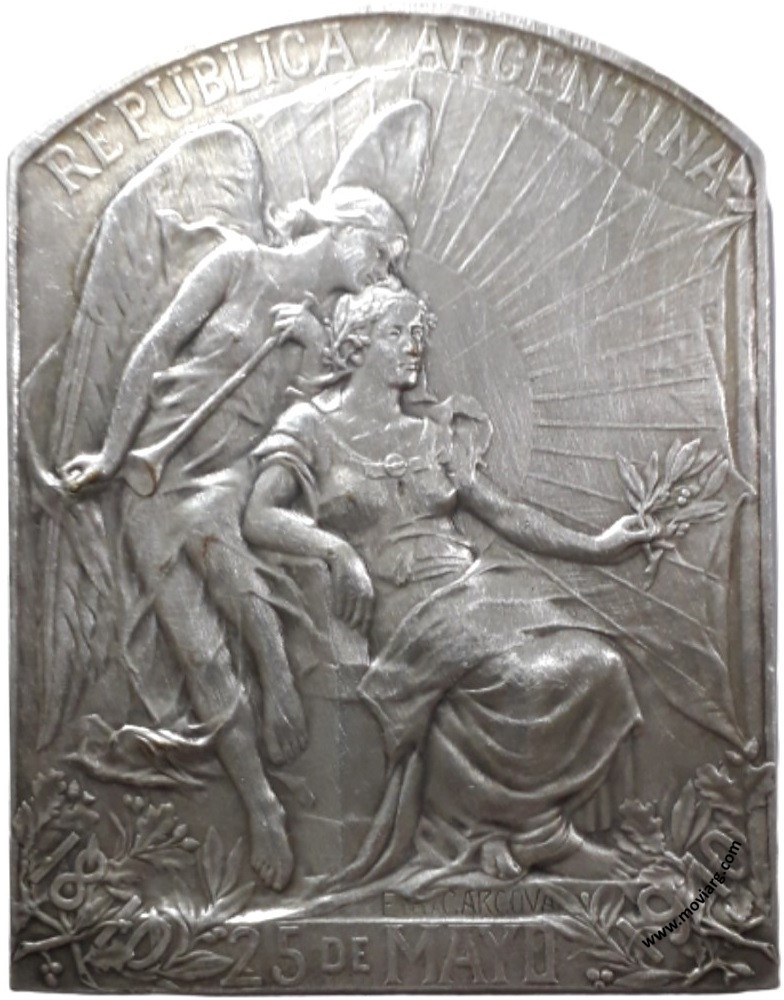 Anverso: REPUBLICA ARGENTINA / 1810 25 DE MAYO 1910. Firma: E. DE LA CARCOVA Reverso: EXPOSICION / INTERNACIONAL / DE / ARTE / BUENOS - AIRES. Firma: E DE LA CARCOVA Referencia: BURZIO-1213 | |