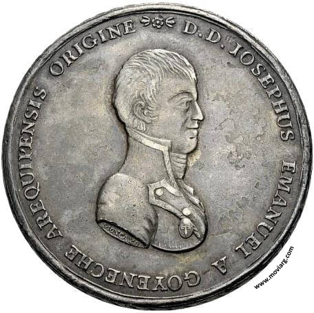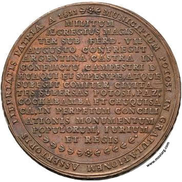Anverso: D.D. JOSEPHUS EMANUEL A GOYENECHE AREQUIPENSIS ORIGINE. Firma: MONCAYO Reverso: MUNICIPIUM POTOSI IN GRATULATIONEM ASSERTORIS LIBERTATIS PATRIÆ A 1811 / MILITUM / ÆGREGIUS MAGIS / TER SUB FERD. VII / AUGUSTO CONFREGIT / ARGENTINA CASTRA IN / CONFLICTU CAMPESTRI Ð / HUAQUI ET SYPESYPE, ATQUE / SUBEGIT COMITER CIVITA: / TES SUBERSAS POTOSI, PAZ, / COCHABAMBA ET CHUQUISA / CA, IN PERPETUM CONCILI / ATIONIS MONUMENTUM / POPULORUM, IURIUM, / ET REGIS Canto: Laureado Referencia: | |