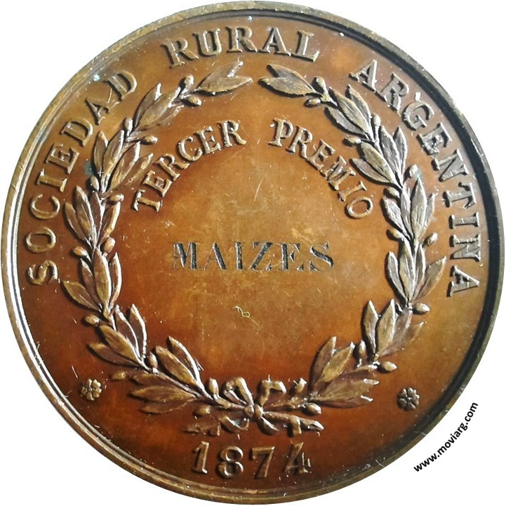 Anverso: CULTIVAR EL SUELO ES SERVIR A LA PATRIA. Firma: MASSONNET EDIT. / PARIS Reverso: SOCIEDAD RURAL ARGENTINA / 1874 / TERCER PREMIO / [ MAIZES ] Canto: Humberto Burzio: "Buenos Aires en la medalla" 1981 p437. Arnaldo Cunietti-Ferrando: "Historia de las Medallas Argentinas" 2010 p299. Referencia: BURZIO-1252 | |