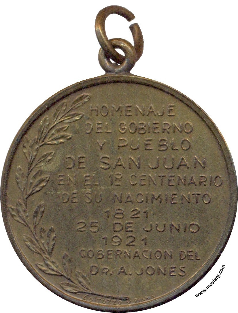 Anverso: DR. GUILLERMO RAWSON Reverso: HOMENAJE / DEL GOBIERNO / Y PUEBLO / DE SAN JUAN / EN EL 1R. CENTENARIO / DE SU NACIMIENTO / 1821 / 25 DE JUNIO / 1921 / GOBERNACION DEL / DR. A. JONES. Firma: GOTTUZZO Y PIANA Referencia: | |