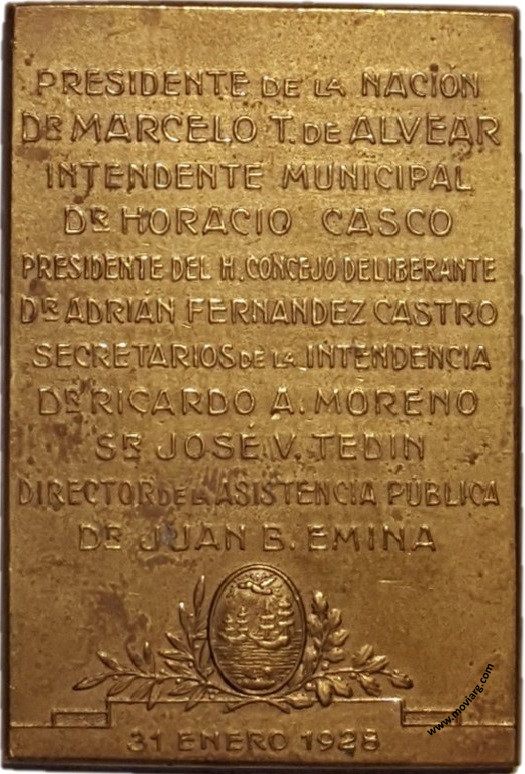 Anverso: HOSPITAL PREVENTORIO / MANUEL ROCCA. Firma: M. VERCELLI Reverso: PRESIDENTE DE LA NACIÓN / DR. MARCELO T. DE ALVEAR / INTENDENTE MUNICIPAL / DR. HORACIO CASCO / PRESIDENTE DEL H. CONCEJO DELIBERANTE / DR. ADRIÁN FERNANDEZ CASTRO / SECRETARIOS DE LA INTENDENCIA / DR. RICARDO A. MORENO / SR. JOSÉ V. TEDIN / DIRECTOR DE ASISTENCIA PÚBLICA / DR. JUAN B. EMINA / 31 ENERO 1928 Referencia: | |