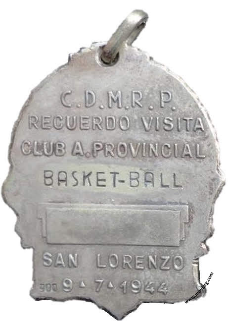 Anverso: Firma: O. GALLO Reverso: C.D.M.R.P. / RECUERDO VISITA / CLUB A. PROVINCIAL / [ BASKET - BALL ] / SAN LORENZO / 9 · 7 · 1944. Exergo: [ 900 ] Referencia: | |