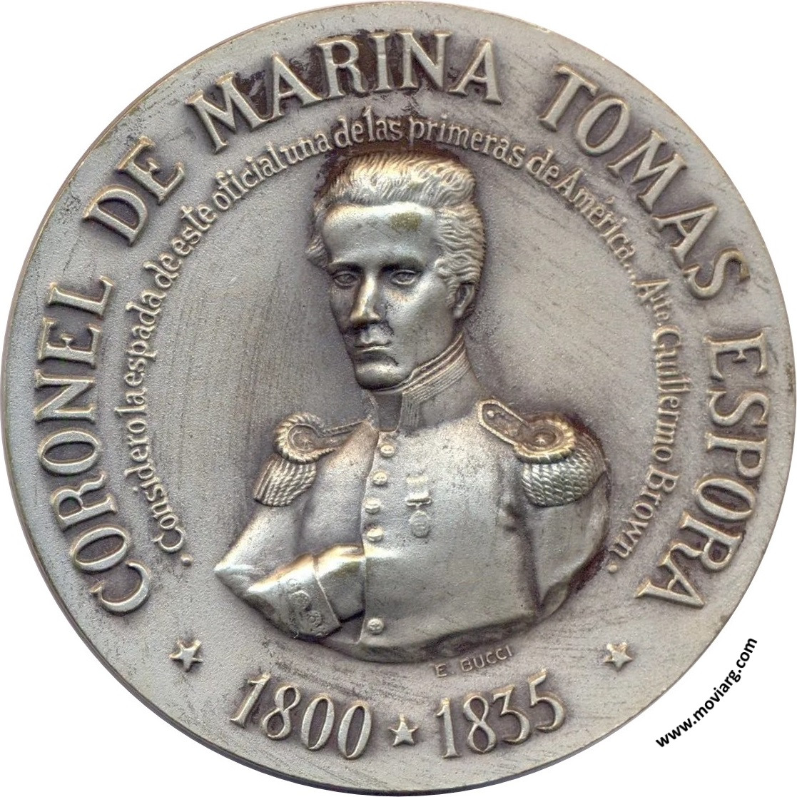 Anverso: CORONEL DE MARINA TOMAS ESPORA / 1800 - 1835 / CONSIDERO LA ESPADA DE ESTE OFICIAL UNA DE LAS PRIMERA DE AMÉRICA... ATTE. GUILLERMO BROWN. Firma: E. BUCCI Reverso: CREACION DEL MUSEO NAVAL TOMAS ESPORA / SECRETARIA DE ESTADO DE MARINA / RESOLUCION N° 988 24 / V / 963 / " SÓLO ME PRECIO DE POSEER LO QUE DÁ LA MAR / A UN MARINERO; ASÍ COMO ME HONRO DE / TENER MÁS HERIDAS EN MI CUERPO / QUE GRADOS EN MI UNIFORME " / TOMAS ESPORA. Firma: CAP. E. BIGGERI Referencia: | |